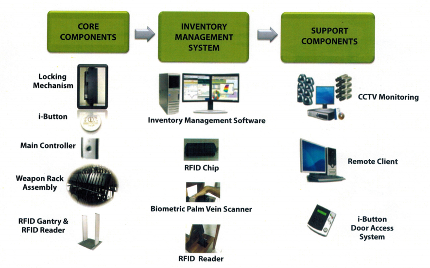 ARMIS is a secured and intelligent fire arms management system, designed to be mounted stationary or on mobile racking. Utilizing the i-button advanced digital key and Palm Vein biometric authentication, it will protect againt theft and misues of firearms. ARMIS is protected from lock picking and can be networked for armory inventory and access control purposes.